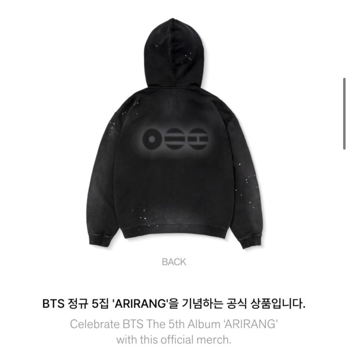 Este hoodie forma parte de la línea de merchandising lanzada junto al álbum ARIRANG, con un diseño exclusivo inspirado en el concepto de la era.